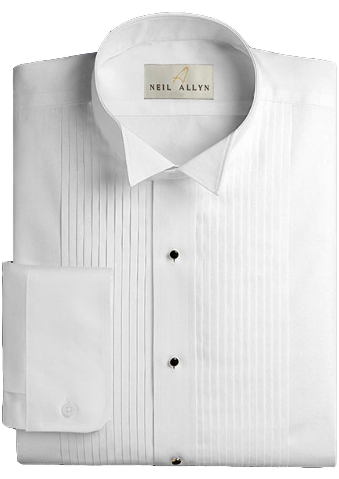 Look Great wearing this comfortable tuxedo shirt from Neil Allyn. This shirt is made using a polycotton blend and includes a wing collar. It features 1/4" pleats and convertible cuffs; this means this amazing shirt comes with buttons, but can convert to be worn with cufflinks and studs if desired! Also, this shirt can be worn with a pre-tied long tie or bowtie.