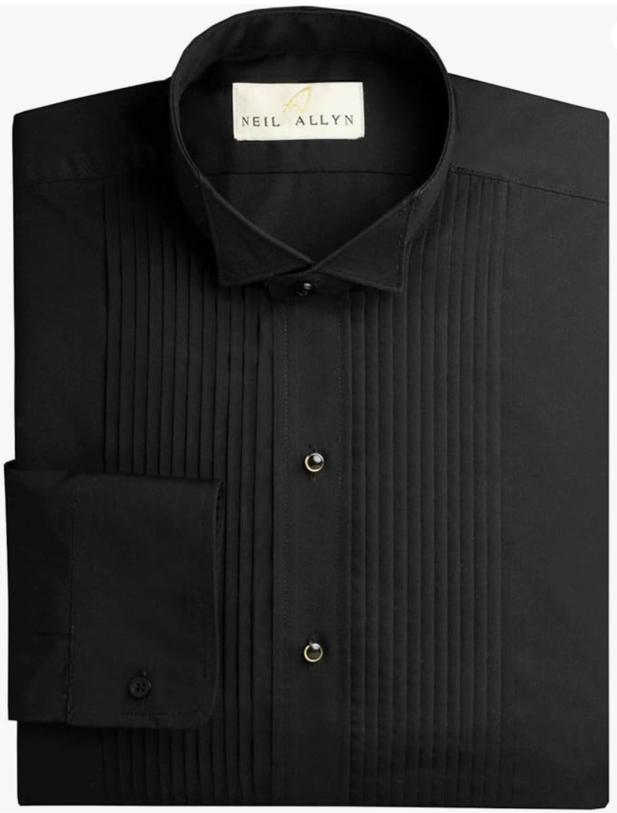 Look Great wearing this comfortable tuxedo shirt from Neil Allyn. This black shirt is made using a polycotton blend and includes a wing collar. It features 1/4" pleats and convertible cuffs; this means this amazing shirt comes with buttons, but can convert to be worn with cufflinks and studs if desired! Also, this shirt can be worn with a pre-tied long tie or bowtie.